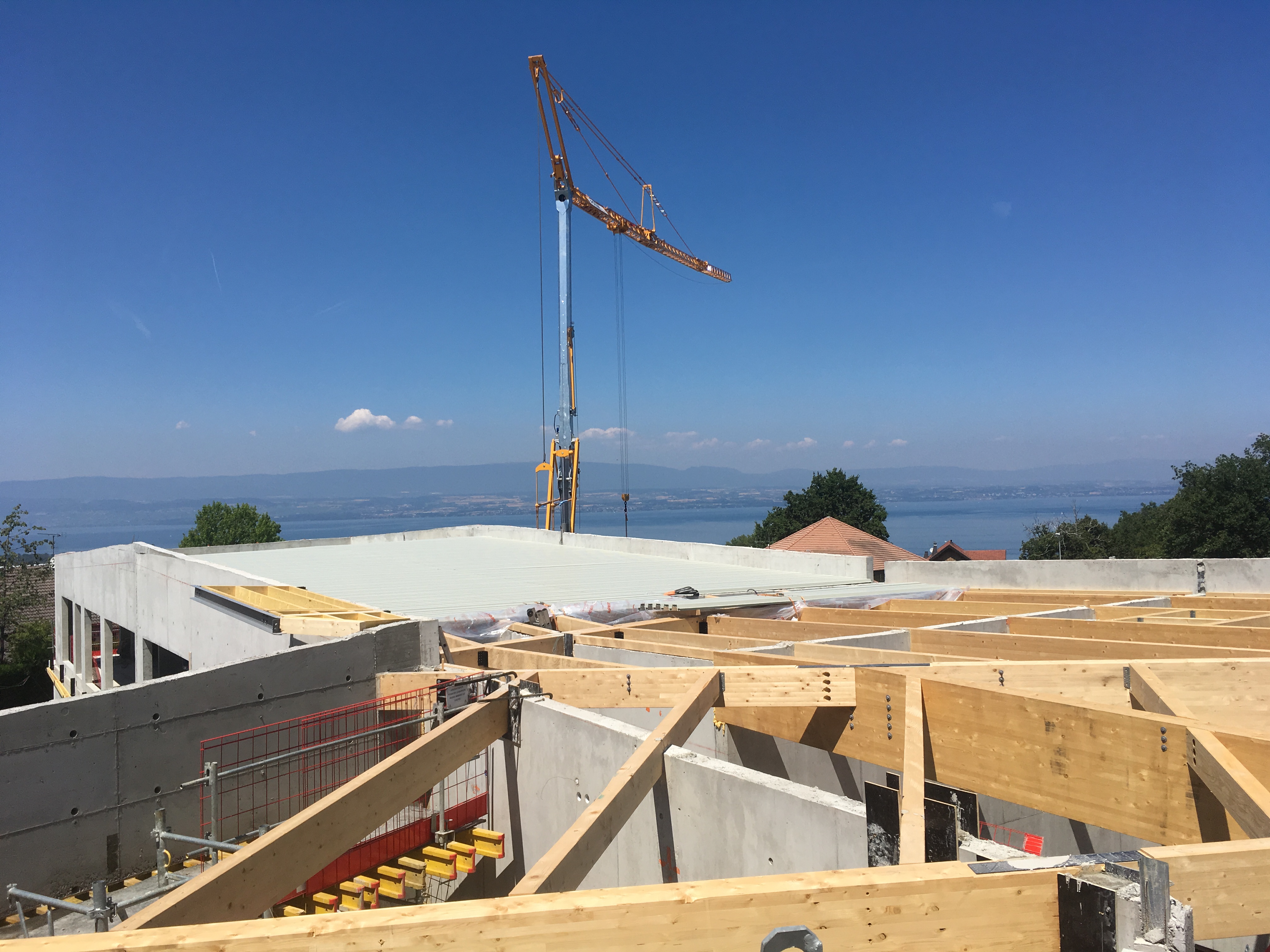 Montage de charpente, vue sur le lac Léman