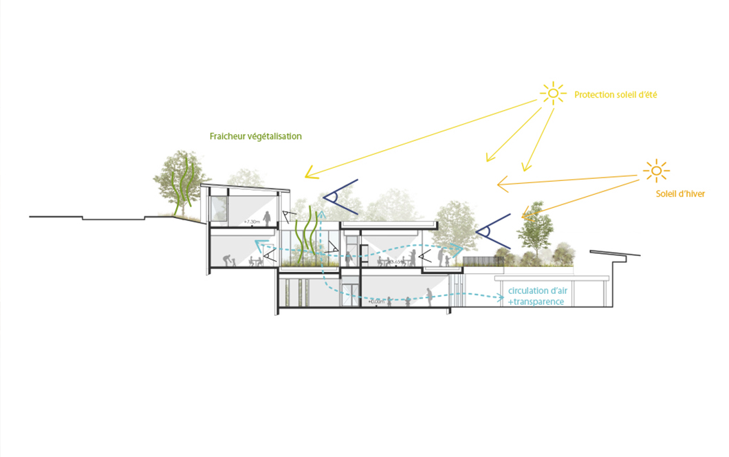 Accueil et espace du personnel au RDC haut. Salles d’activités et de repos au RDC intermediaire avec accès par une liaison piétonne.