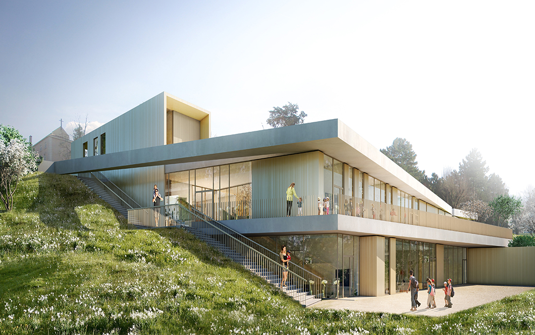 Création d’un pôle enfance à Charbonnières-les-Bains dans un site en forte pente. Création d’une batiment en 3 rez-de-chaussée.