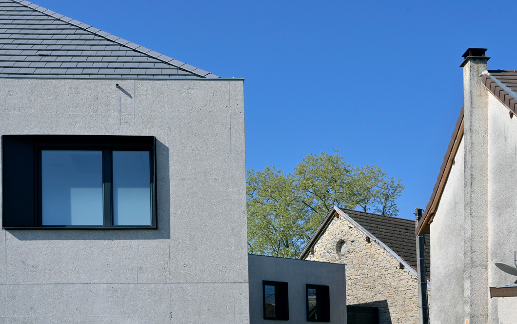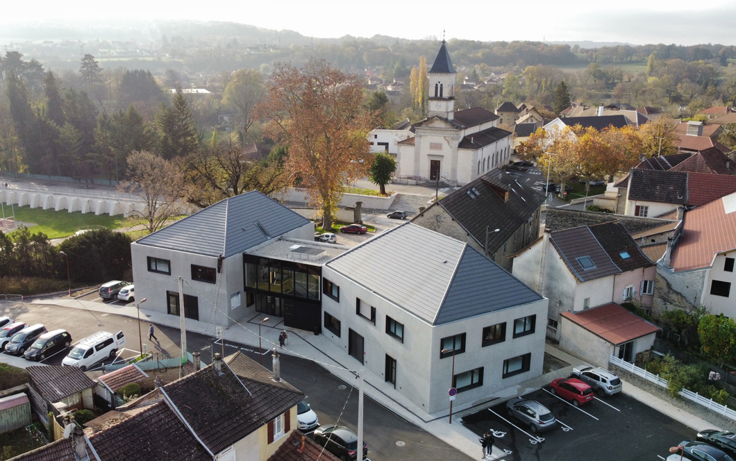 Le bâtiment sera réalisé en béton, isolé par l’intérieur pour valoriser l’aspect minéral à l’extérieur, avec une texture de béton de teinte sable clair, proche de celle des pierres de la médiathèque et de l’enduit de l’église. Ce matériau qui participe à la dynamique de l’économie locale est pérenne, et permet d’ancrer formellement et esthétiquement la maison de santé dans son territoire. Pour assumer pleinement cette logique nous proposons des toitures à 4 pans sur chacun des volumes.