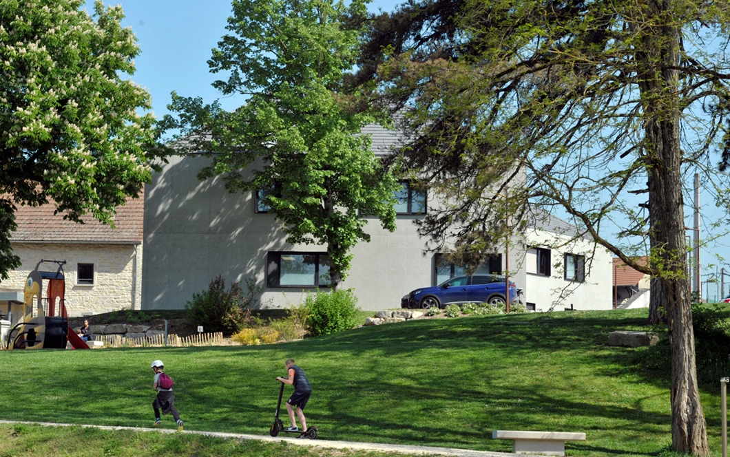 Le bâtiment s’articule pour épouser au mieux la forme du tènement et suivre l’angle de la nouvelle voie, repositionnée de manière à prolonger au maximum la rue du Château existante au Nord et à libérer de la place pour les parkings nécessaires au fonctionnement de la maison de santé. L’espace public et les parkings sont végétalisés et planté d’arbre de haute tiges qui viennent accompagner la transition depuis le parc vers le centre bourg.